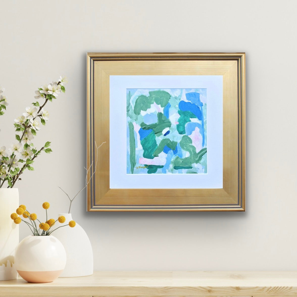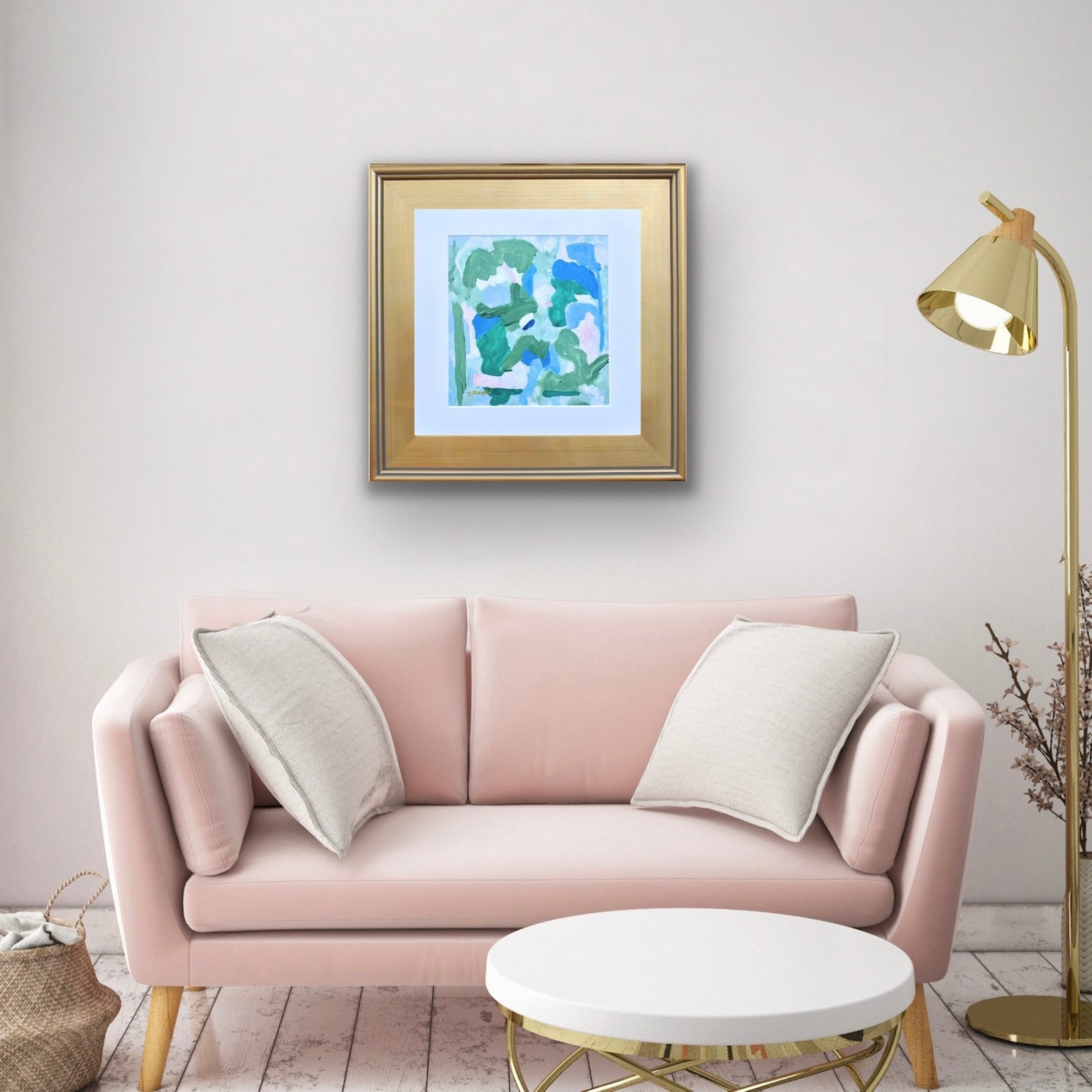 This original abstract painting is created on heavyweight cold press watercolor paper, blending soothing shades of green, blue, pink, and white in an expressive, painterly style. Full of movement and texture, this green and blue abstract art evokes the feeling of ocean tides and coastal breezes.