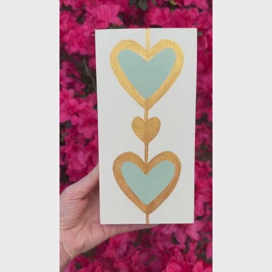 Bold Heart Original Art. This small vertical painting has two green hearts outlined in gold with a gold heart between them. It is on a white background with gold sides.