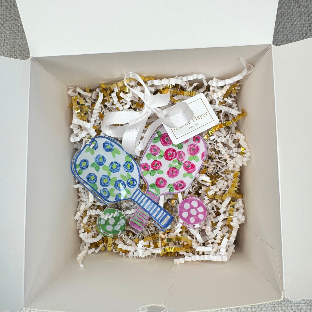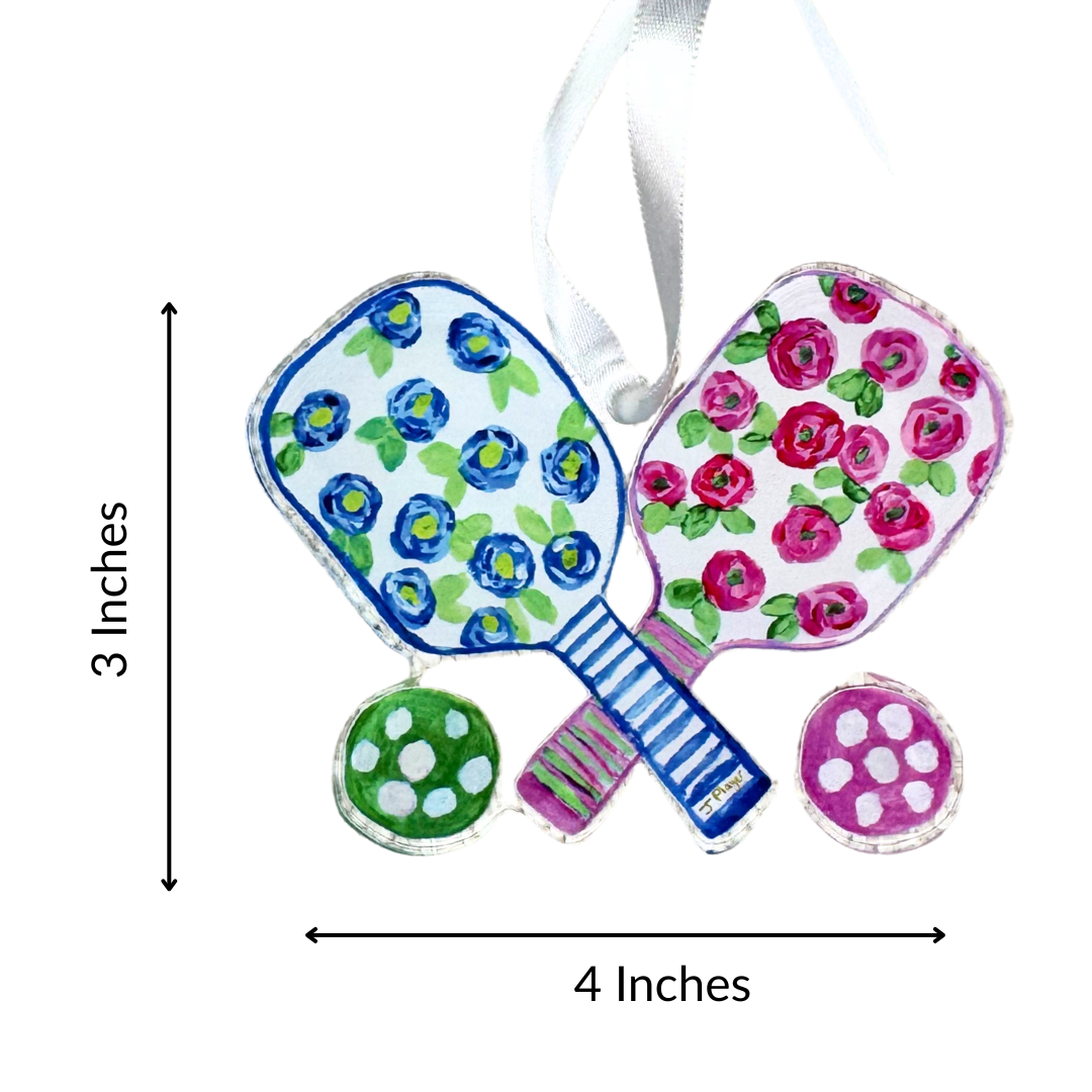 Add a playful pop of color to your holiday décor with this Pickleball Christmas Ornament, featuring Jeanne Player’s original floral paddle artwork in pink, blue, rose, green, and white. Designed in a fun paddle cutout shape, this lightweight acrylic ornament is the perfect keepsake for any pickleball lover.