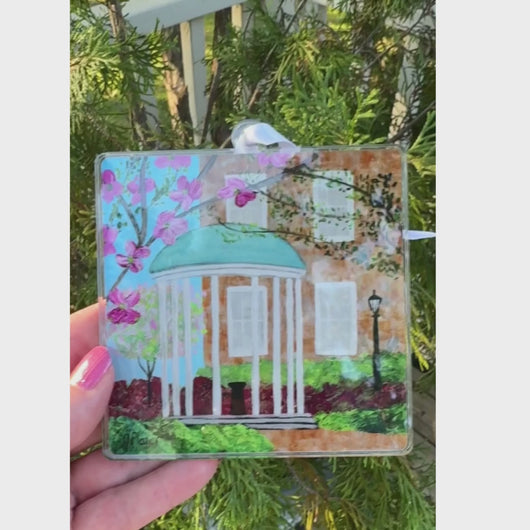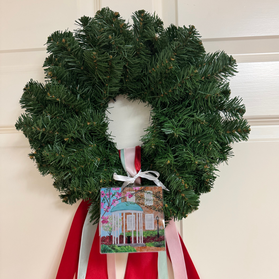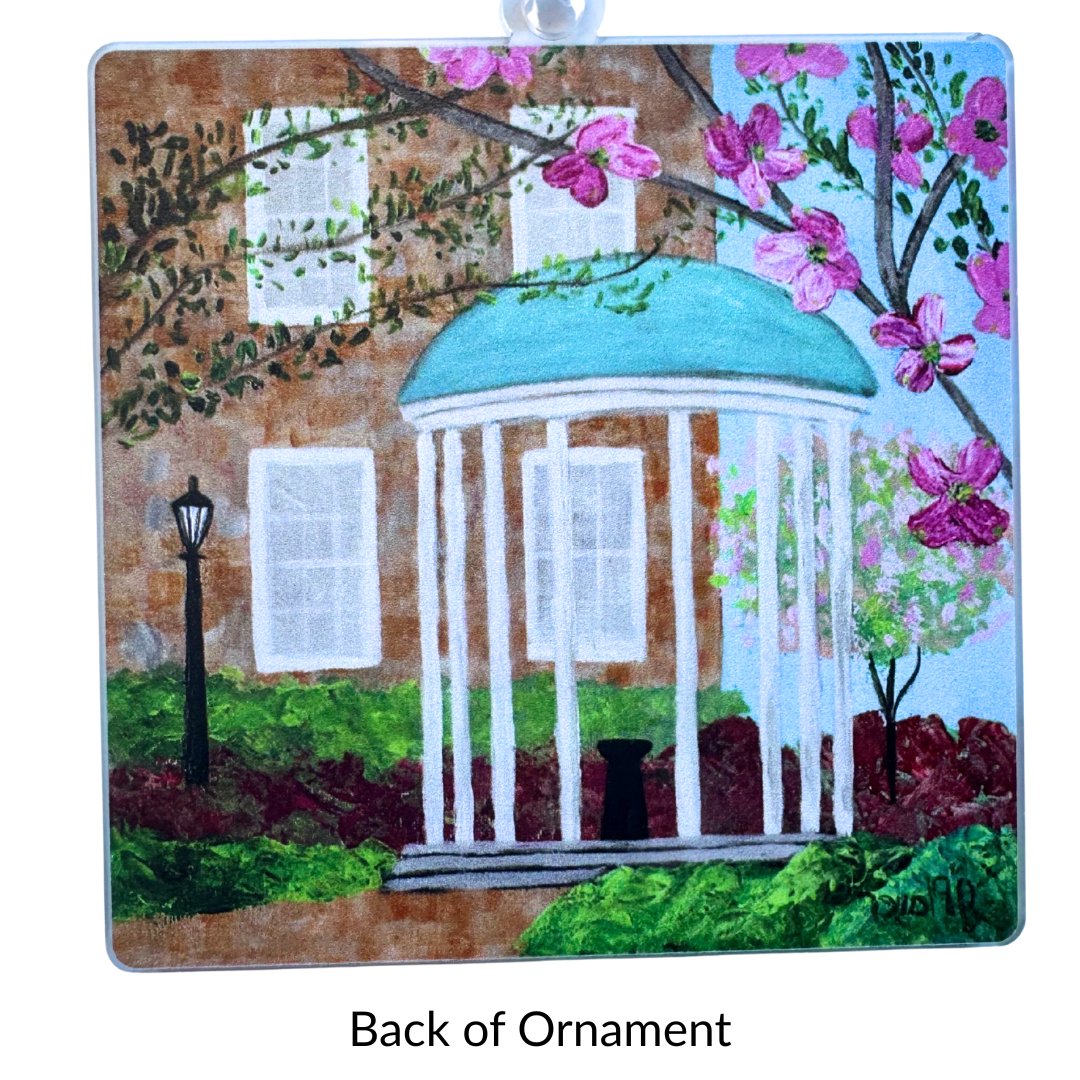 Crafted by printing the artwork on heavyweight paper and affixing it to durable acrylic, the ornament measures 4 x 4 inches and comes ready to hang with an adjustable satin ribbon. Whether displayed on your Christmas tree, tied to a gift, or used as a decorative accent year-round, it’s a meaningful keepsake that celebrates both UNC tradition and timeless Southern style.
