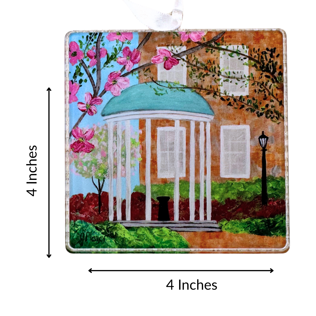 Bring Southern charm and Tar Heel pride to your holidays with this UNC Old Well Acrylic Ornament. Featuring Jeanne Player’s original artwork of the iconic Old Well (original painting now sold), this lightweight square ornament beautifully captures the elegance and tradition of Chapel Hill’s most beloved landmark.