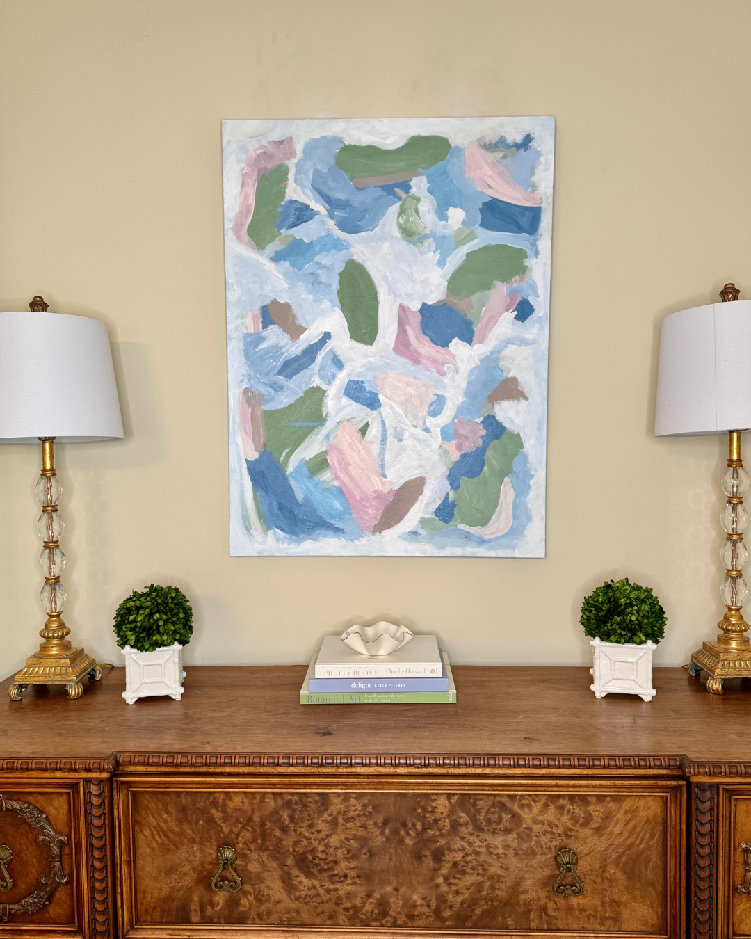 Shades of blue, light blue, green, blush, rose, white, brown, and subtle hints of orange and yellow move across the canvas in a way that energizes a space without overwhelming it. The result is elevated color — lively, but polished.