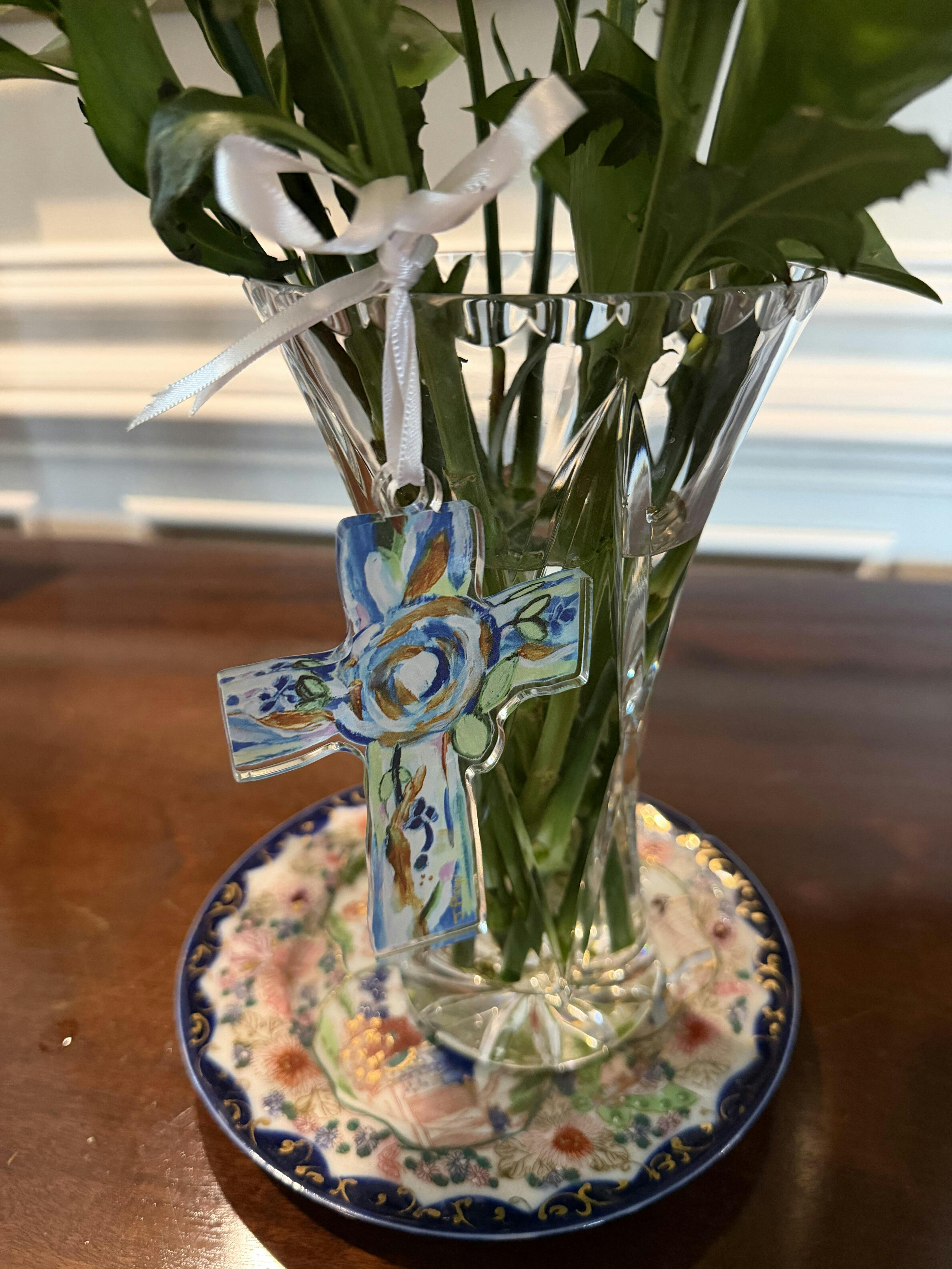 Crafted from durable acrylic, this shatterproof cross ornament is lightweight yet luminous, with the artwork reproduced on both the front and back. Finished with a delicate white satin ribbon, it’s ready to hang on your tree, a wreath, display on an ornament stand, or tie onto a meaningful gift.