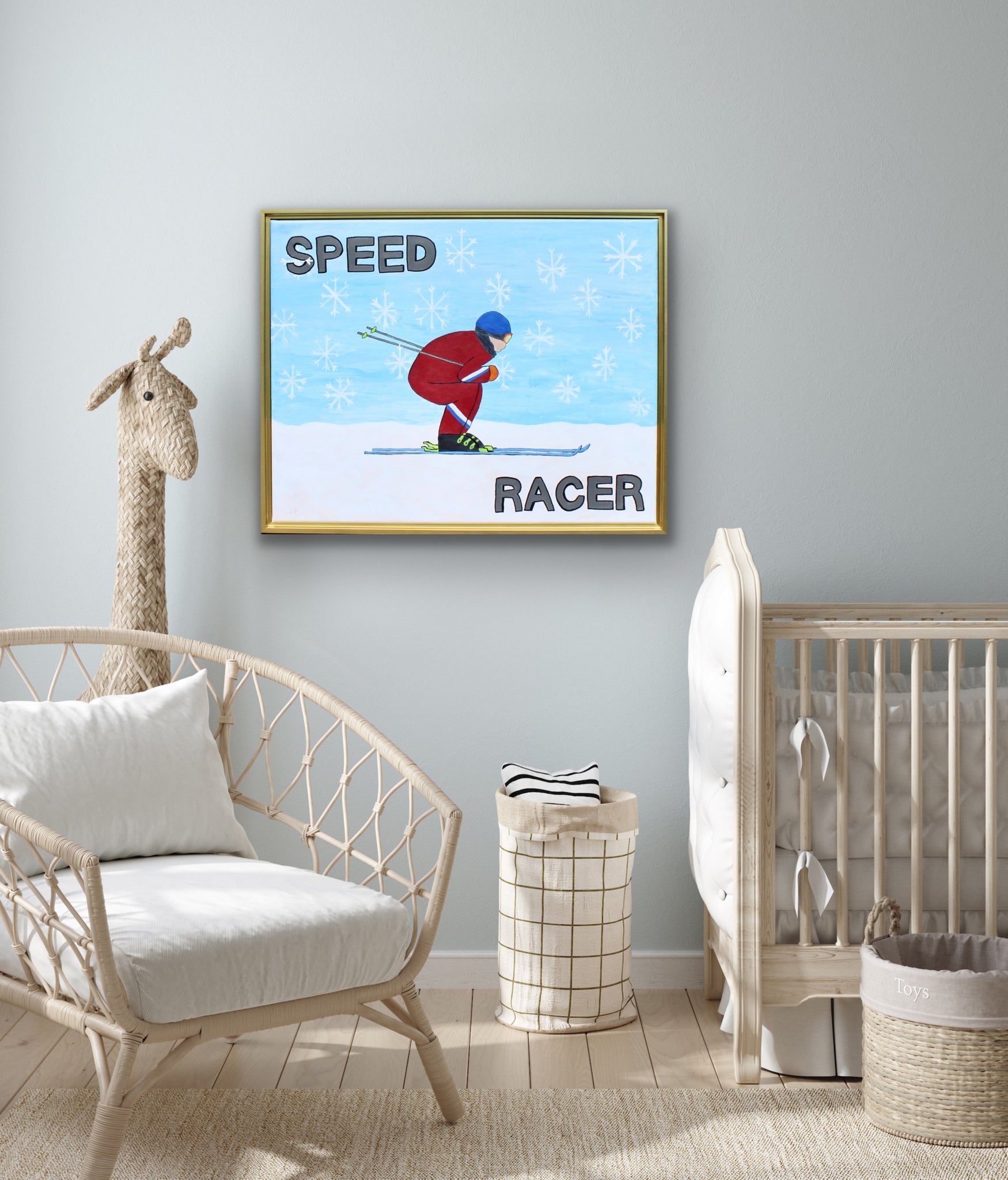 Bring bold energy and winter charm into your space with Speed Racer, an original pop art style painting celebrating the thrill of skiing. This one-of-a-kind artwork measures 22 x 28 x 0.5 inches and arrives ready to hang.