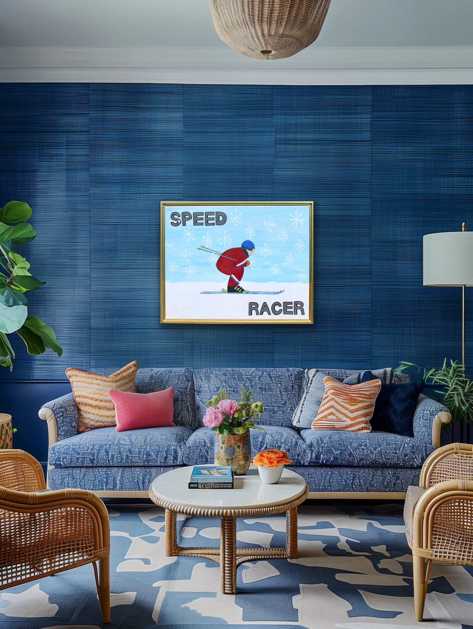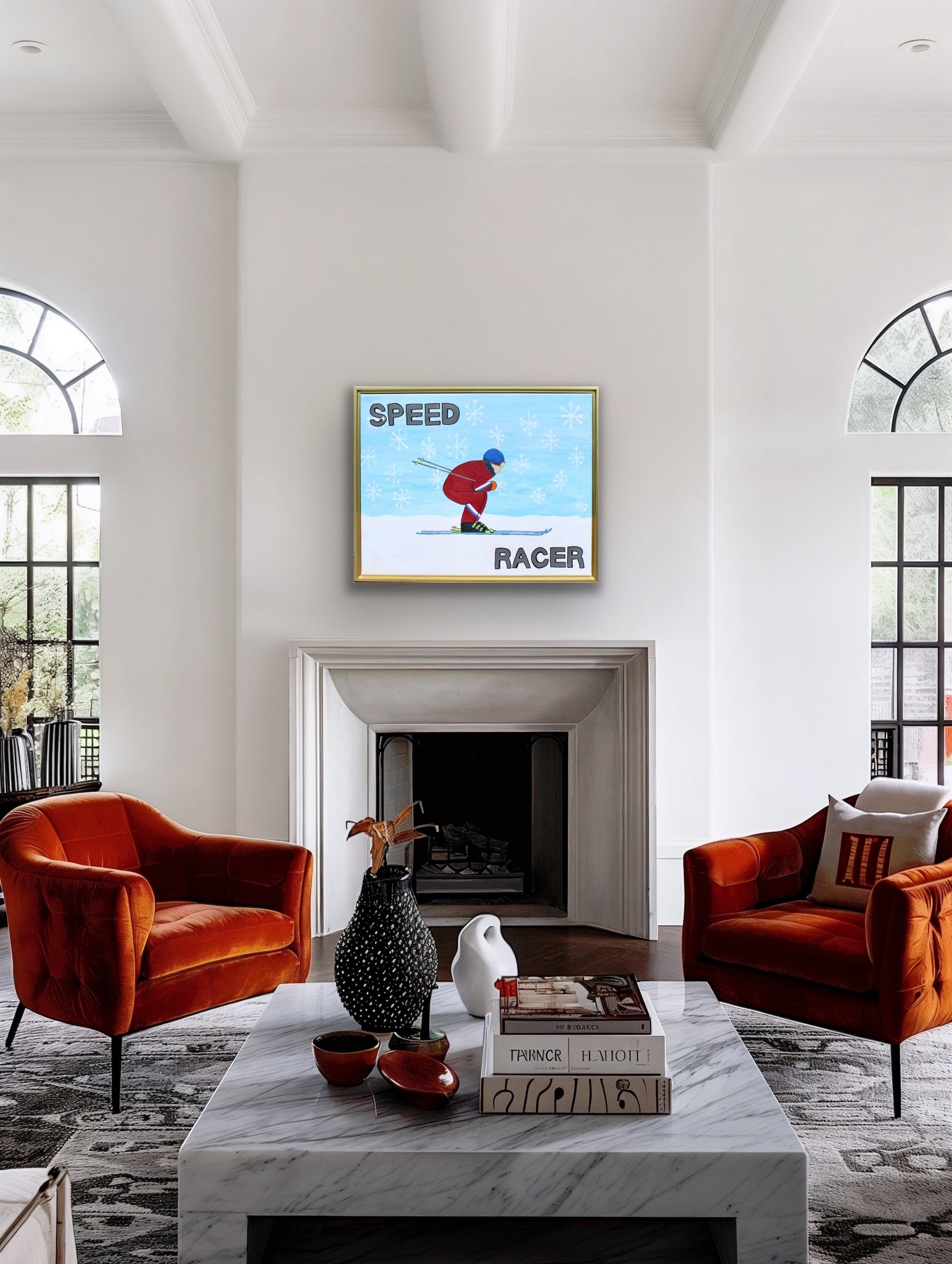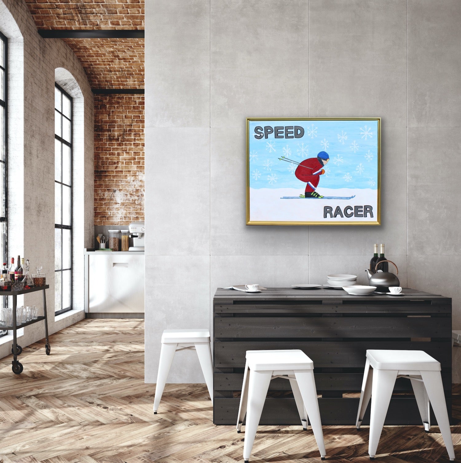 Set against a playful oversized snowflake background, this vibrant piece captures the fast-paced fun of snow skiing with bold colors and whimsical detail. It’s the perfect focal point for a mountain home, ski lodge, or any space in need of a joyful, sporty conversation starter.